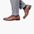يتميز زوج من الأحذية الرسمية بمقدمة دائرية بمقدمة بنية اللون بتصميم منتظم، مع إغلاق سهل الارتداء.
