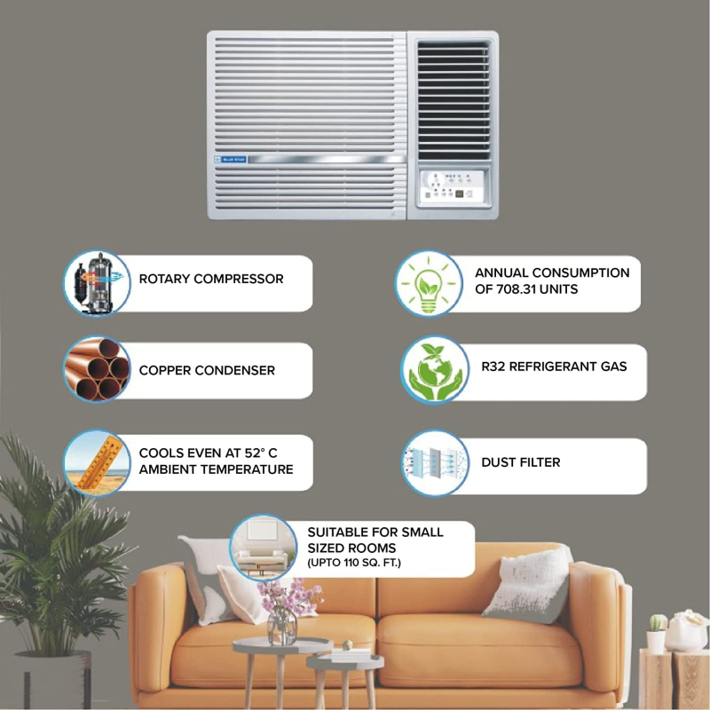 • Blue Star Window ACs offer unsurpassed cooling thanks to its highly efficient rotary compressor and are fully loaded with sleep mode and antifreeze thermostat features.