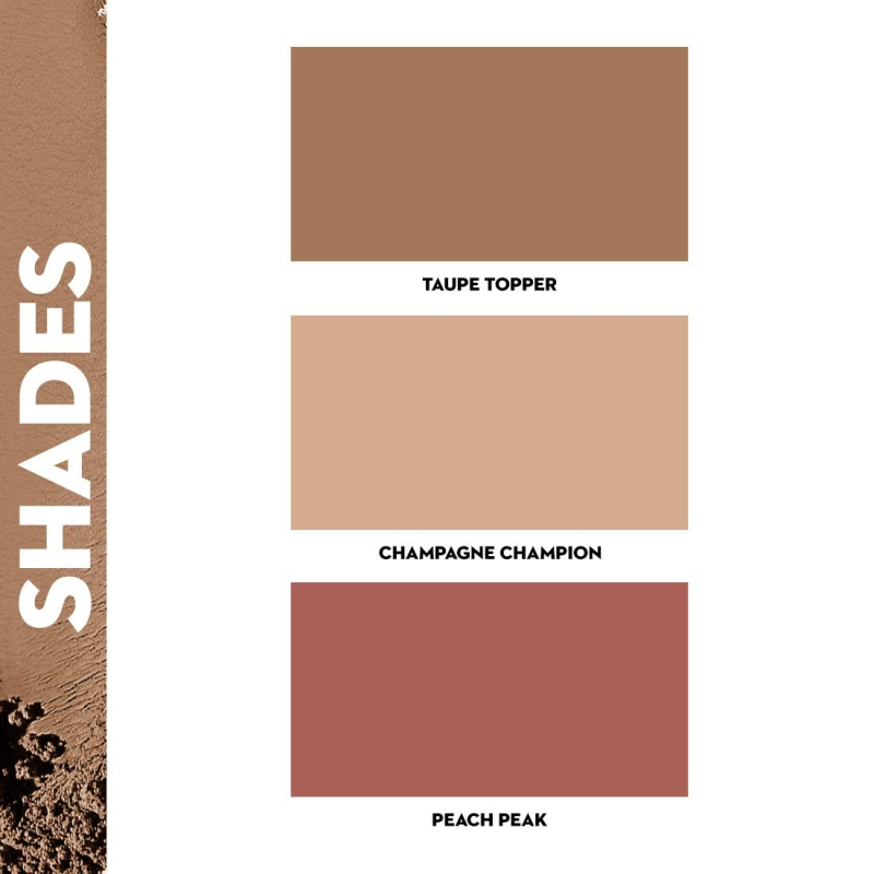 • (L to R): Taupe Topper (Cool-toned Brown Bronzer), Champagne Champion (Champagne Gold Highlighter), and Peach Peak (Soft Peach Pink Blush)