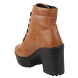 • A pair of black/Brown/tan/Grey round toe heeled boots, has high-top styling, lace-ups detail